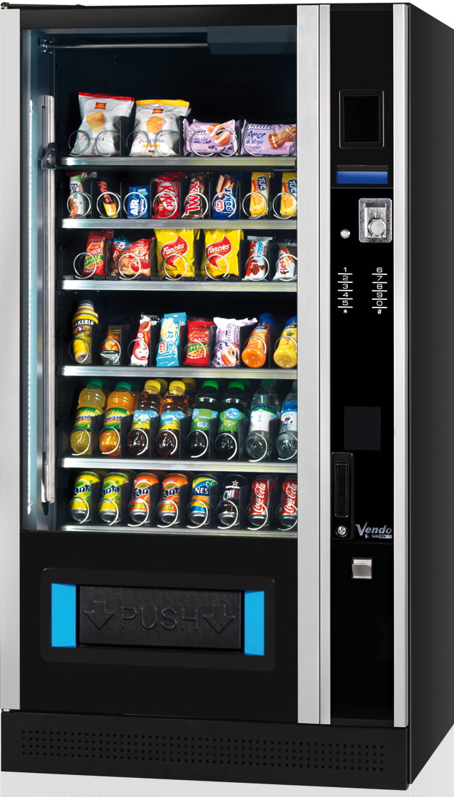 Die Anlage bietet 3 Ebenen für Kuchen, Tütenware und Snacks, 1 Ebene für Durstlöscher und 2 Ebenen für Kaltgetränke in PET-Flaschen.